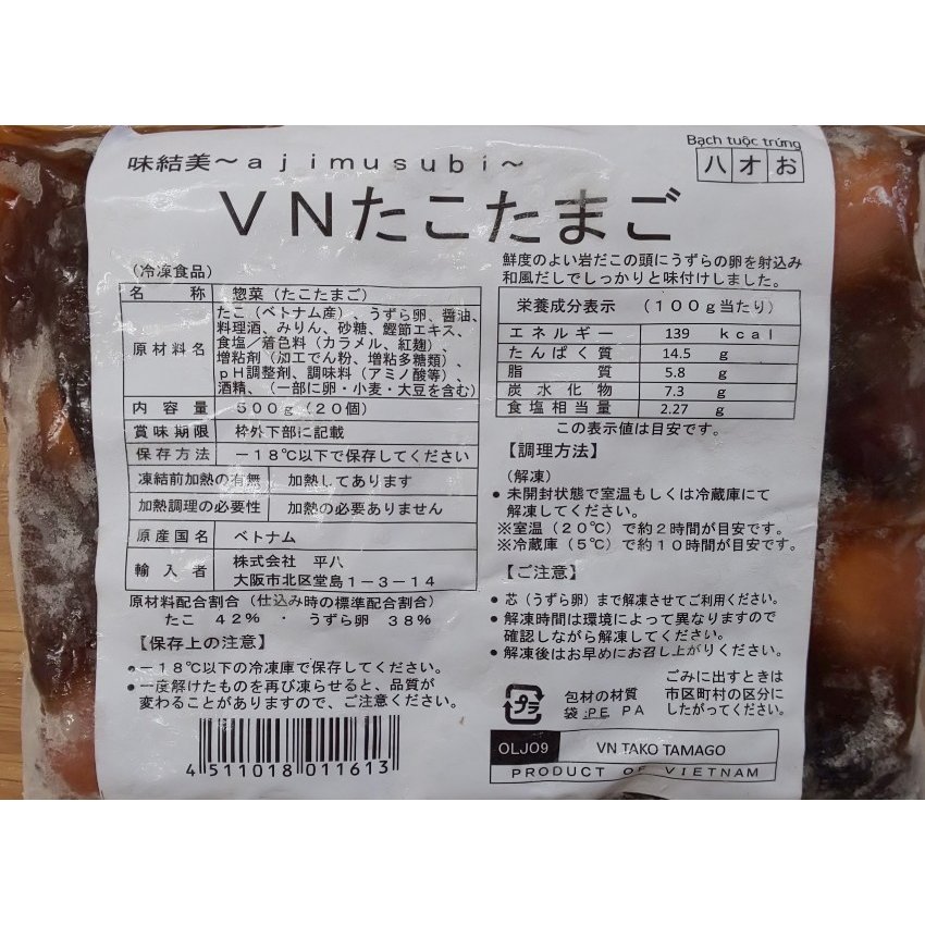 単価: 1280円/500g(P)(税別) 受注最小ロット: 25600円/500g×20P(税別) 生(原)産地:ベトナム 賞味期限: 約6か月(冷凍) 鮮度の良い岩蛸の頭にうずらの卵を射込み、和風だし汁でしっかり味付けしました。